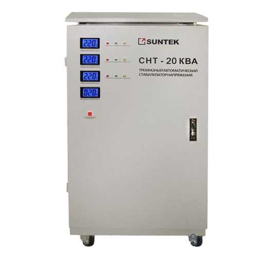 Стабилизатор трехфазный SUNTEK СНТ 20000 ВА используется для защиты оборудования, установленного на промышленных объектах, в частных домах, дачах, от перепадов напряжения и короткого замыкания. Стабилизатор поддерживает широкий диапазон входного напряжения и отключается только при выходе за рамки фазного 120-285 Вольт.