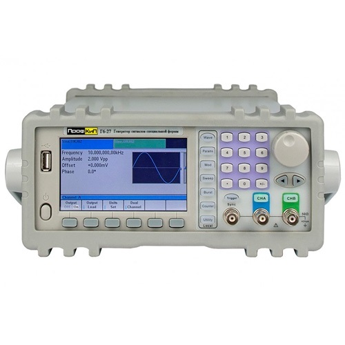 Генераторы сигналов специальной формы двухканальные ПрофКиП Г6-27 созданы для воспроизведения высокостабильных по частоте сигналов синусоидальной, прямоугольной, треугольной, импульсной формы, а так же шумового сигнала и напряжения постоянного тока. Генераторы воспроизводят так же сигналы произвольной формы, имея 50 заводских предустановок, и возможность программирования формы выходного сигнала оператором.