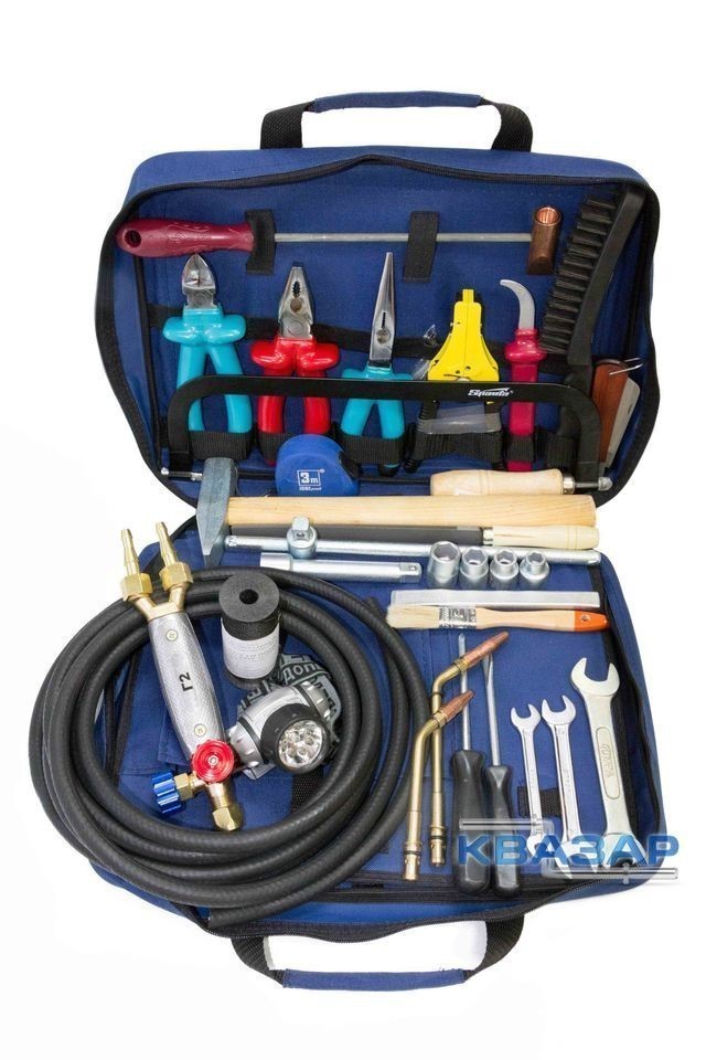 Набор включает в себя длинногубцы, кусачки, кабельный нож, паяльник, ножовку по металлу, напильник, комплект рожковых ключей и торцевых головок, газовую горелку и рукав высокого давления.