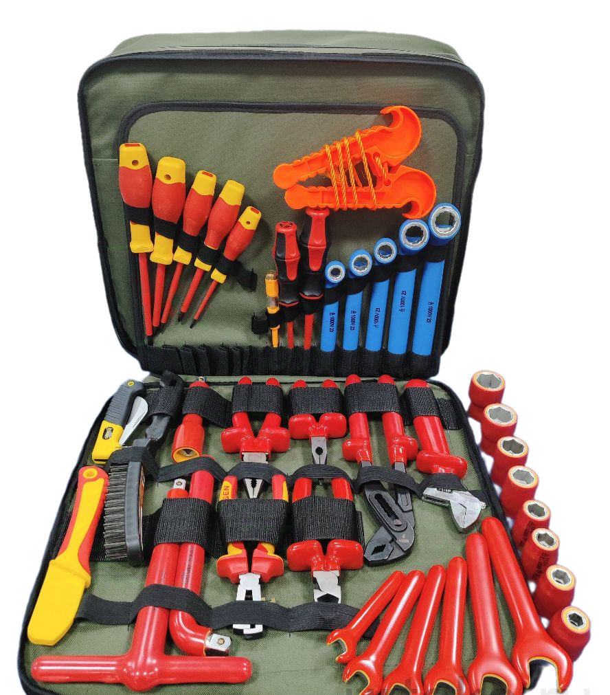 Набор электрика для линейной бригады содержит в удобной инструментальной сумке 35 ручных инструментов, которые прошли на производстве испытание напряжением 10кВ.