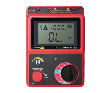 Мегаомметр ПрофКиП Е6-36/1 измеряет сопротивление изоляции в диапазоне от 0 Ом до 20 ГОм. Измеритель сопротивления изоляции позволяет производить измерение напряжением от 50 В до 1000 В, которое разбито на 5 фиксированных режимов. Помимо сопротивления, прибор позволяет измерять напряжение электрической цепи. Тестер изоляции ПрофКиП Е6-36/1 при измерении выводит показания на ЖК-дисплей, оснащенный подсветкой.