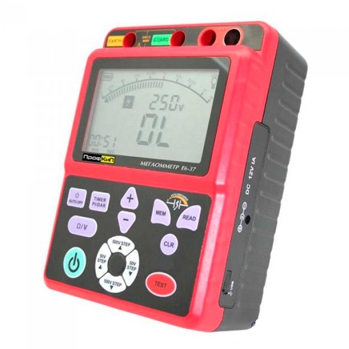 Мегаомметр цифровой ПрофКиП Е6-37 представляет собой один из лучших в своей ценовой категории прибор. Мегаомметр ПрофКиП Е6-37 позволяет производить измерения сопротивления изоляции проводки и различных электротехнических устройств, источников питания, трансформаторов и генераторов. Измеритель сопротивления изоляции может использоваться в мастерских по ремонту электрических устройств. Мегаомметр ПрофКиП Е6-37 производит измерение сопротивления в пределах от 0 до 1000 ГОм, используя для этой цели 5 режимов с номинальным напряжением 250 В /500 В /1000 В /2500 В /5000 В. Измеритель сопротивления изоляции имеет возможность калибровки.