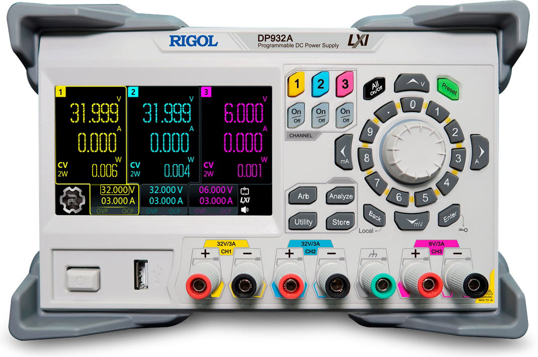 Источник питания постоянного тока лабораторный RIGOL DP932A имеет высокую точность установки и считывания параметров выходных сигналов (напряжение и сила тока) по всем трем выходным каналам, благодаря низкому уровеню шумов и пульсаций.