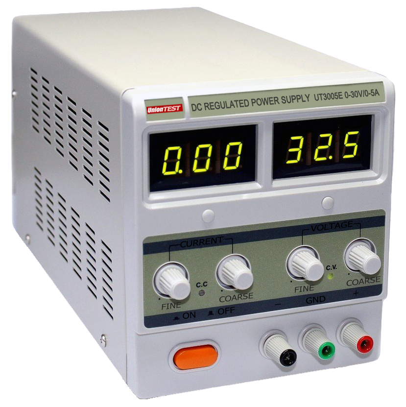 UnionTest UT3005E – источник питания, позволяющий получать регулируемое, точное и стабильное постоянное напряжение или постоянный ток. Две пары регуляторов грубой и точной настройки облегчают установку напряжения и тока, а цифровые индикаторы тока и напряжения упрощают считывание параметров выхода.
