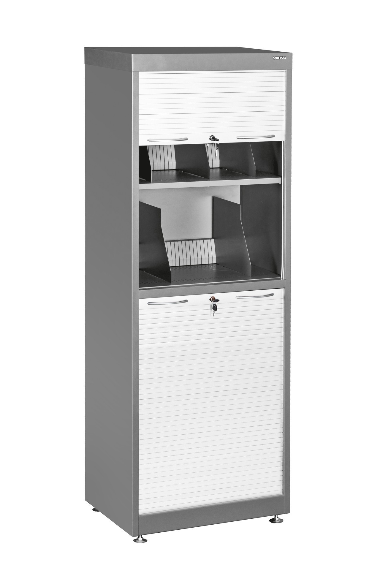 Металлический шкаф для документов, оснащенный двумя закрывающимися секциями, в каждой секции по 2 полки. Обе секции оснащены жалюзийными створками.