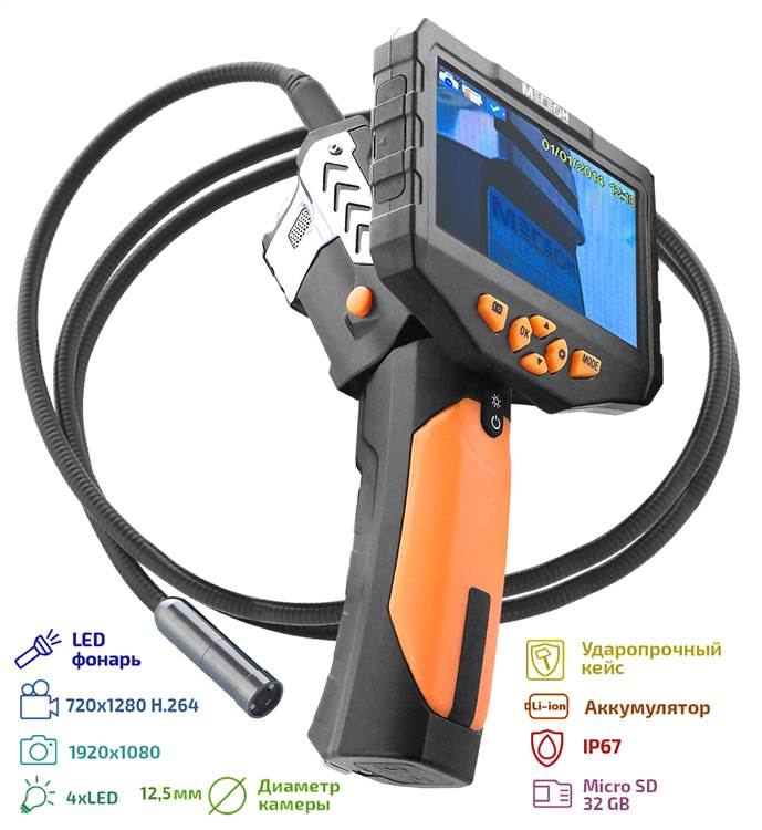 МЕГЕОН 33500-3125 - новинка в модельном ряду цифровых видеоскопов, предназначенный для решения задач в быту и промышленности. Эндоскоп представляет собой устройство для исследования и осмотра скрытых от глаза полостей с возможностью сохранения видеоизображения со звуком на встроенный носитель SDHC 32Гб. Помимо этого предусмотрено получение цветных изображений с помощью фотографий. Большой ЖК-дисплей с разрешением 854 х 480 и диагональю 4,3' отчётливо отобразит всё происходящее перед камерой. Зонд диаметром 6,9 мм и длиной 3 метра имеет полужёсткую конструкцию. Подсветка оснащена шестью яркими светодиодами со ступенчатой регулировкой яркости, которые обеспечивают работу в условиях полного отсутствия освещения. Дополнительно в корпусе предусмотрена подсветка с высокой интенсивности свечения, которая с лёгкость заменит фонарик. Преимущества изделия по достоинству смогут оценить профессионалы и любители.